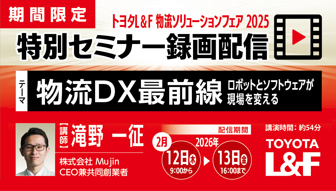 2025年6月~9月に全国6都市で開催したトヨタL&F物流ソリューションフェア2025内で実施しました「特別セミナー」を公式YouTubeチャンネルにて期間限定で録画配信いたします。 「セミナーを自職場のみんなにも見せたい」「都合が合わず行けなかった」などのお声を受け、配信を決定いたしました。この機会にぜひご視聴ください!