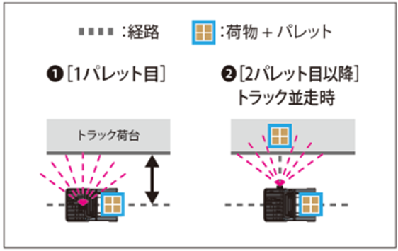 1パレット目は、ヘッドガード上の3D-LiDARで、トラック荷台を検知後、荷役位置を特定し、2パレット目以降は、左右いずれかの3D-LiDARとカメラで1つ前に荷役したパレットを検知し、荷役位置を特定します。